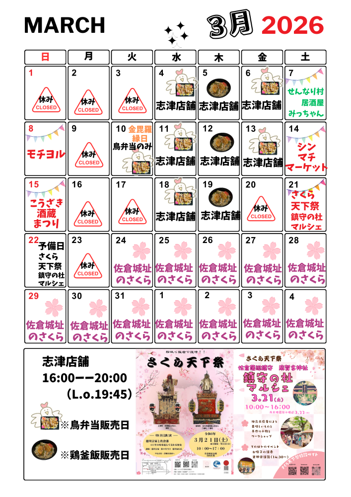 | 営業時間 | ●水曜日〜金曜日 志津店舗営業 16:00〜20:00(L.o19:45) ●3/25〜4/5は佐倉城址公園出店のため、志津店舗は臨時休業 ●土日 イベントもしくは軒先出店 ●毎月10日は金毘羅縁日出店のため他の営業はお休み |